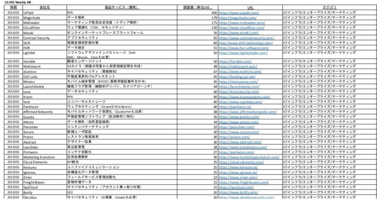 「米国IPO週報」プレミアム版に掲載された「ベンチャーファイナンス」(スタートアップ資金調達)のリストです。一覧性の高いExcelファイルで、検討する案件の情報を社内で共有したり、進捗の状況を管理したりするのに便利です。2026年1月(全業種)の258件について、会社名、製品サービス、資金調達額、URL、カテゴリを簡潔に記載しています。